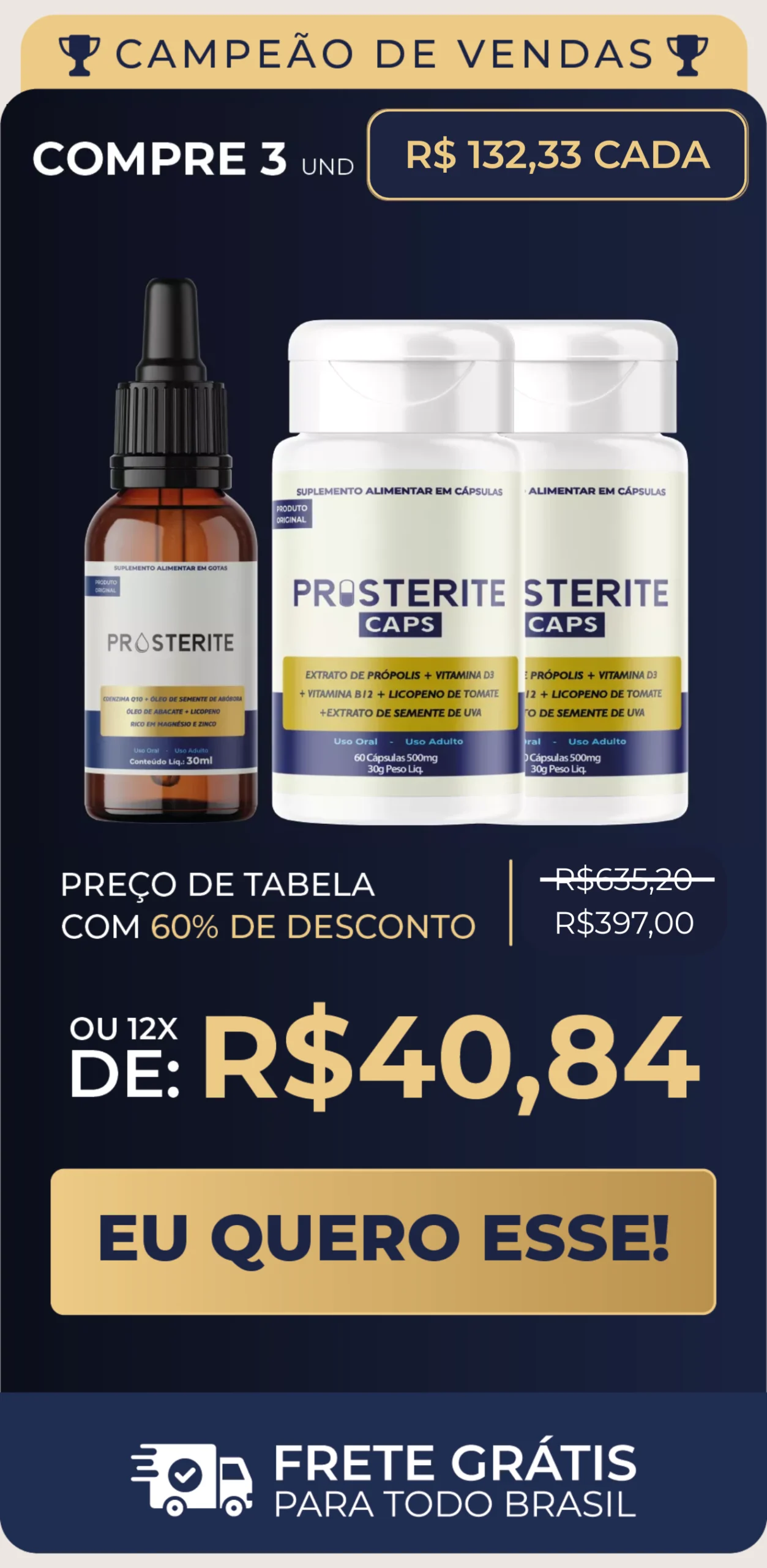 Prosterite Gotas e Prosterite Cápsulas trabalham em sinergia para garantir uma abordagem holística e de longo prazo, dando ao seu corpo as ferramentas necessárias para combater problemas prostáticos e promover o bem-estar geral.